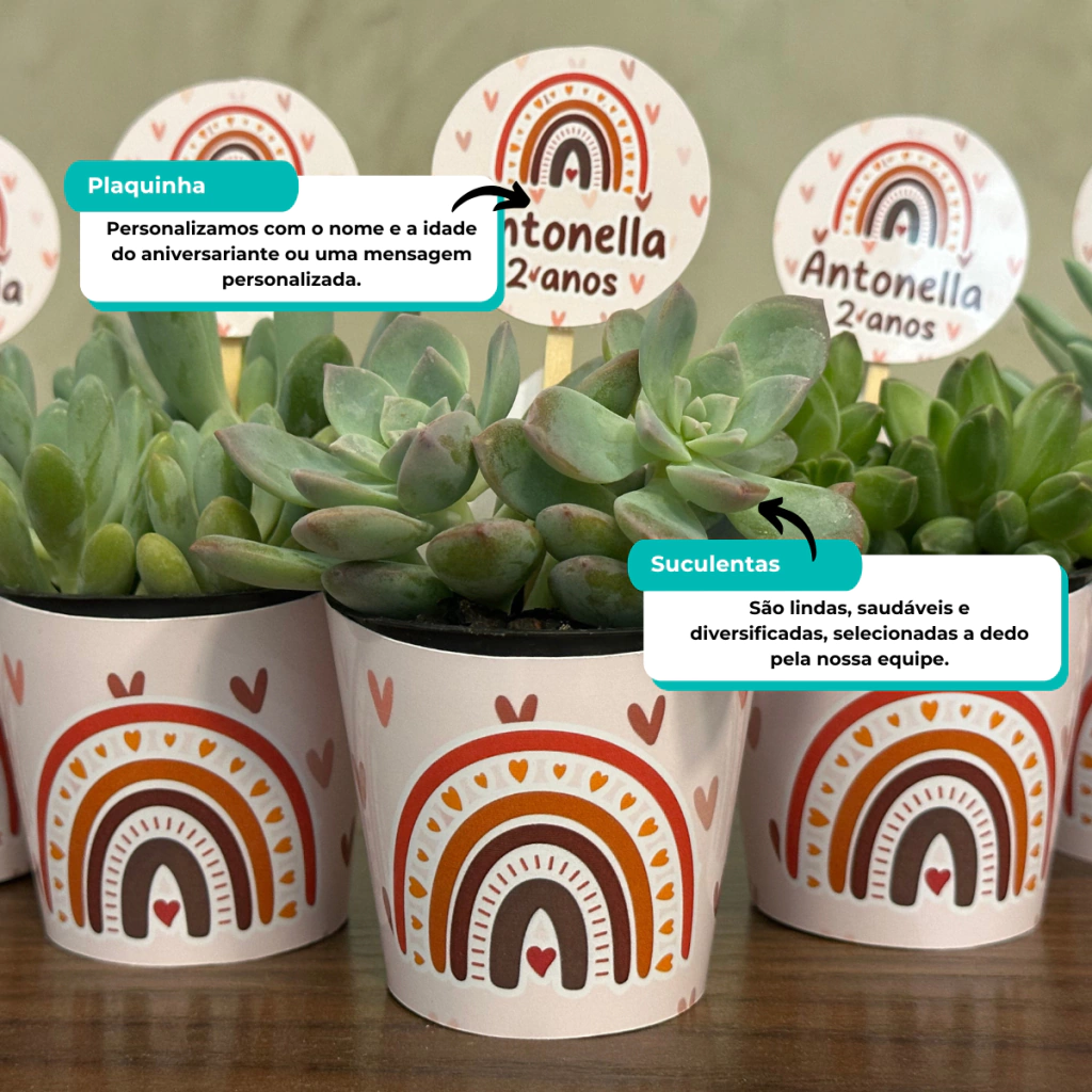 Encante seus convidados com uma lembrancinha delicada e cheia de significado! As mini suculentas personalizadas no tema Arco-Íris Boho são uma forma carinhosa de agradecer a presença nesse momento tão especial, trazendo beleza, leveza e um toque da natureza para a sua festa.